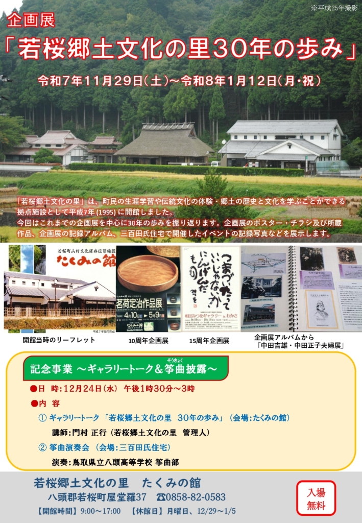 また、記念行事として下記のとおり当館の歴史を振り返るギャラリートークと鳥取県立八頭高等学校筝曲部の演奏会を開催します。